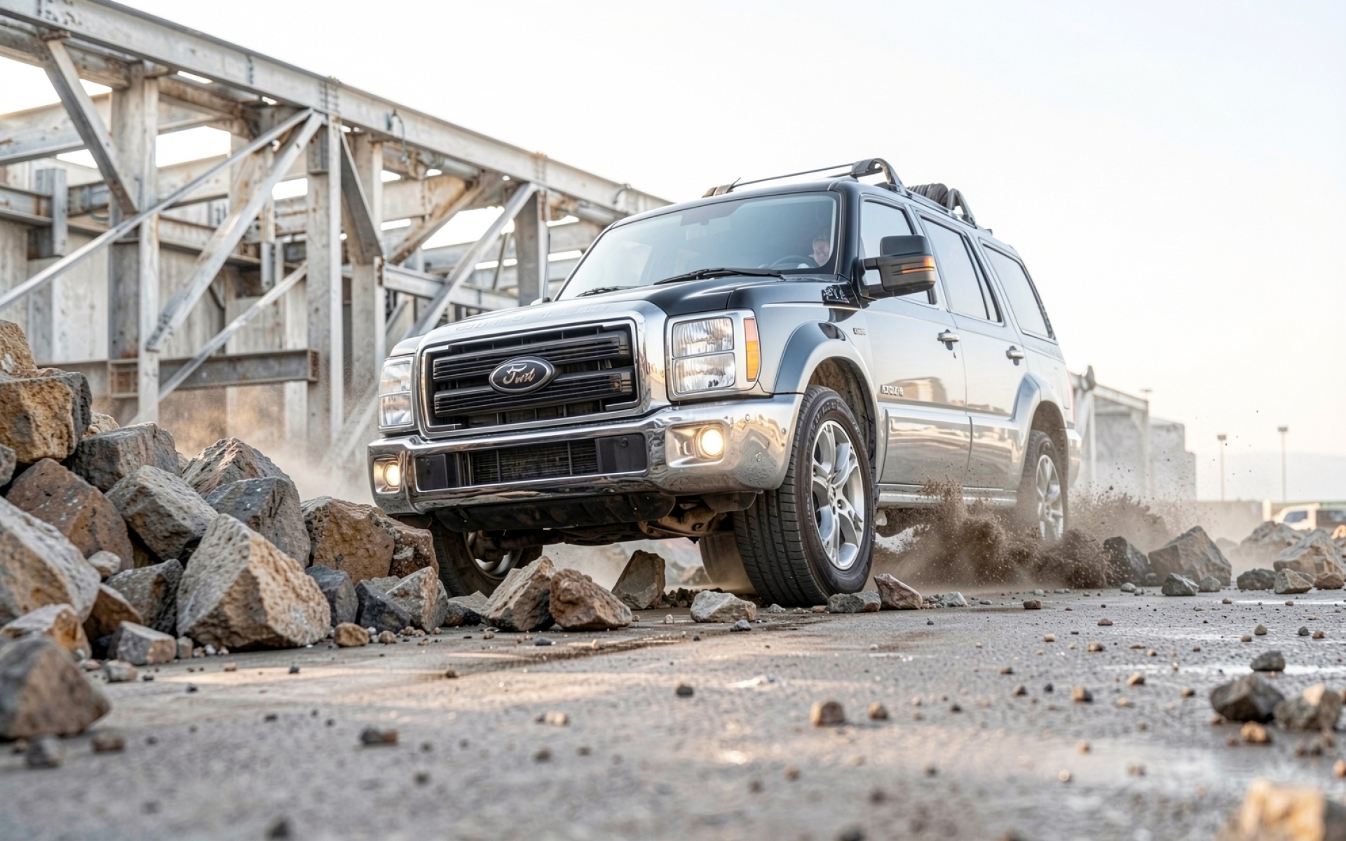 Черный внедорожник Ford на каменистом индустриальном фоне