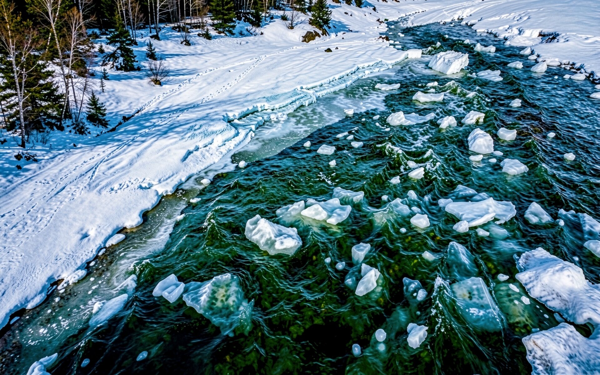 Зимняя река с бирюзовой водой и льдом