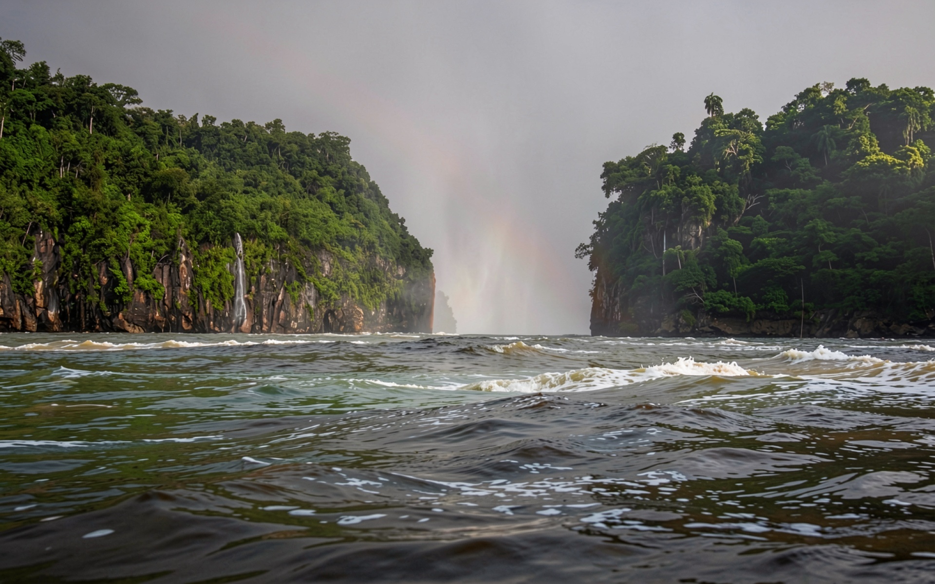 Водопад с радугой в тропическом лесу