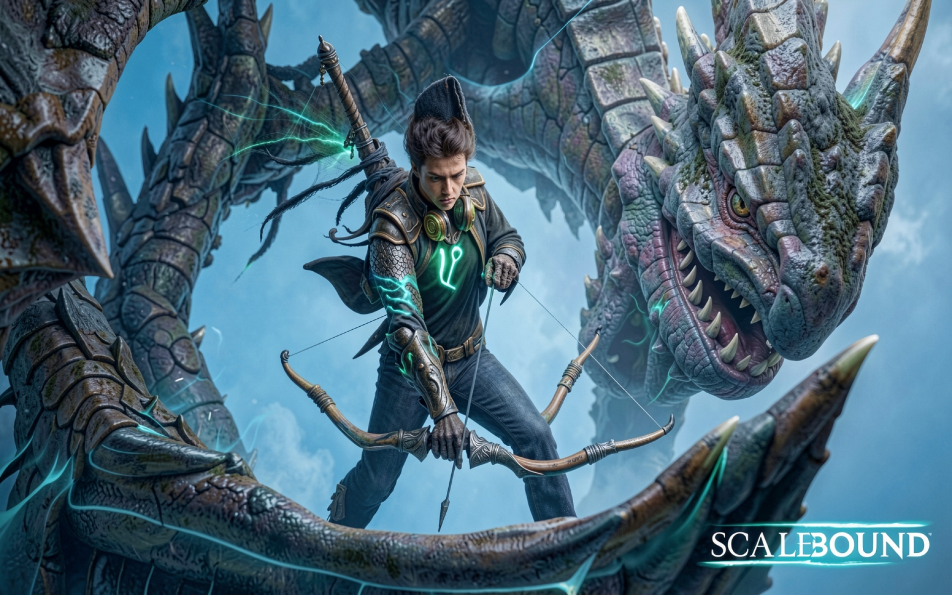 Воин с луком и дракон в синих тонах