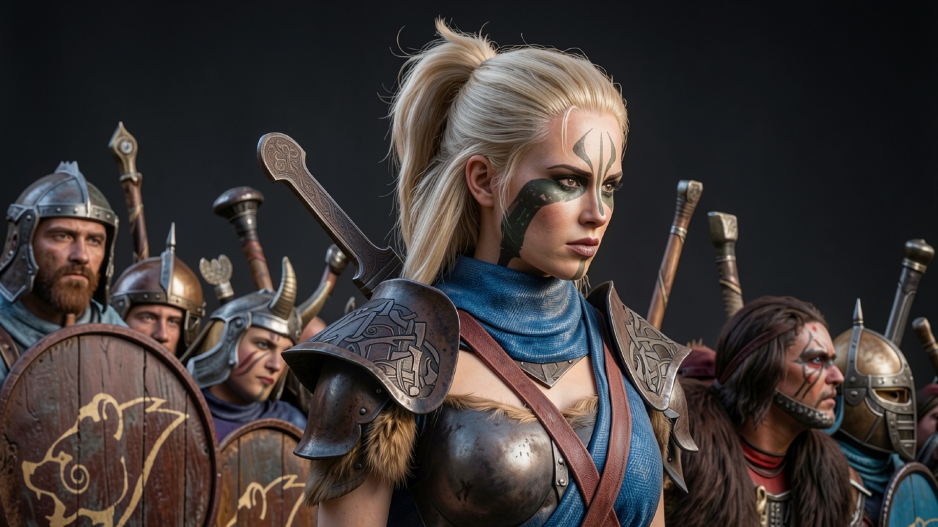 Воительница викинга в синих доспехах с мечом
