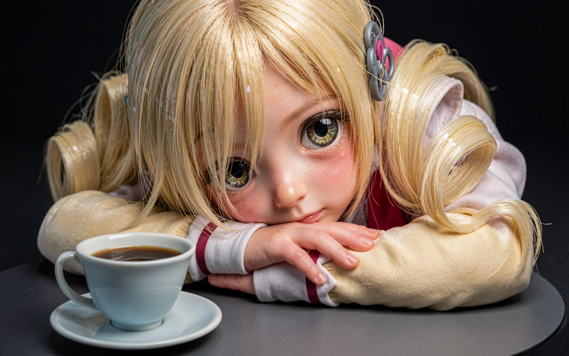 Кукла с блондинистыми волосами и чашка кофе