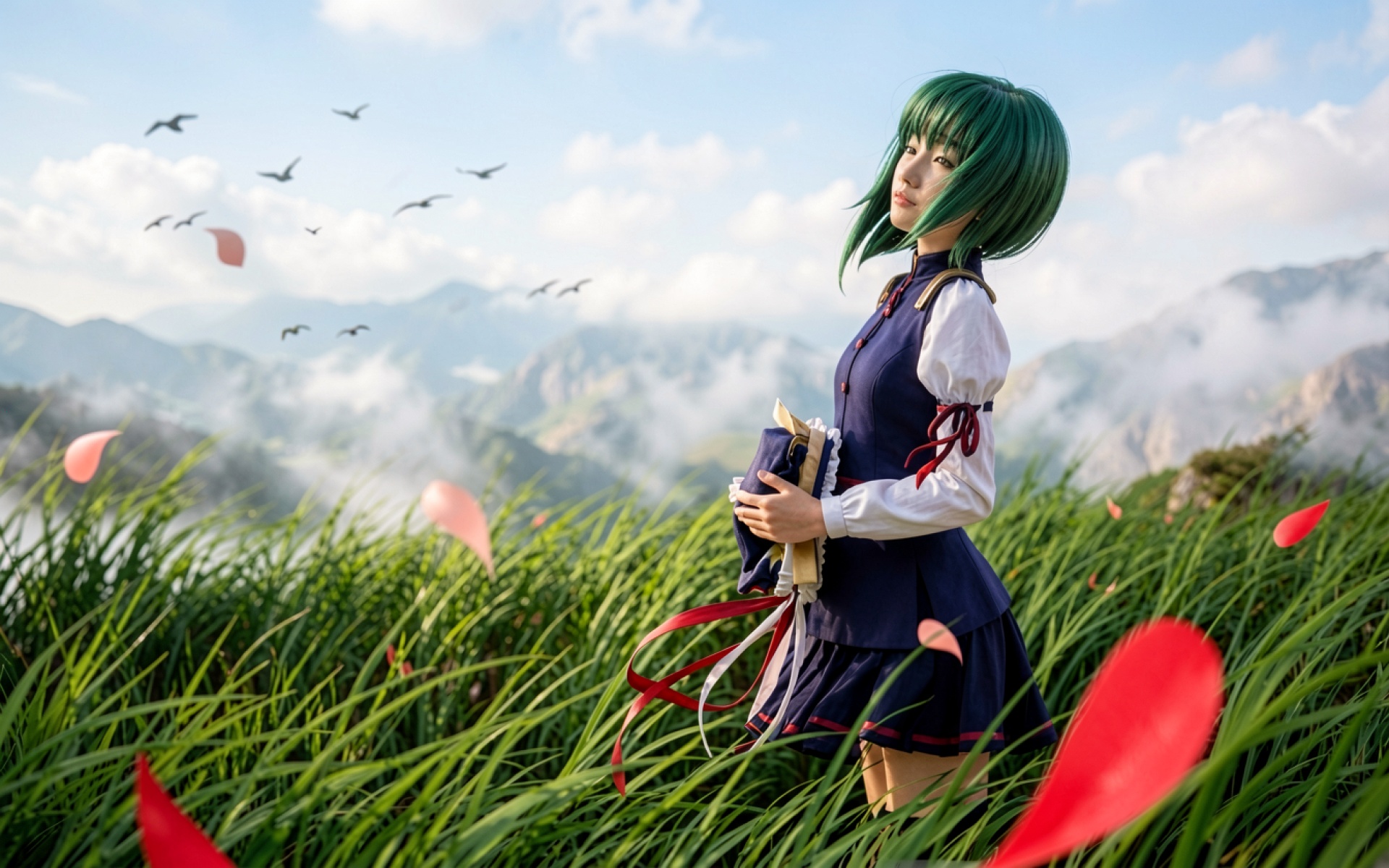 Девушка с зелеными волосами в горах