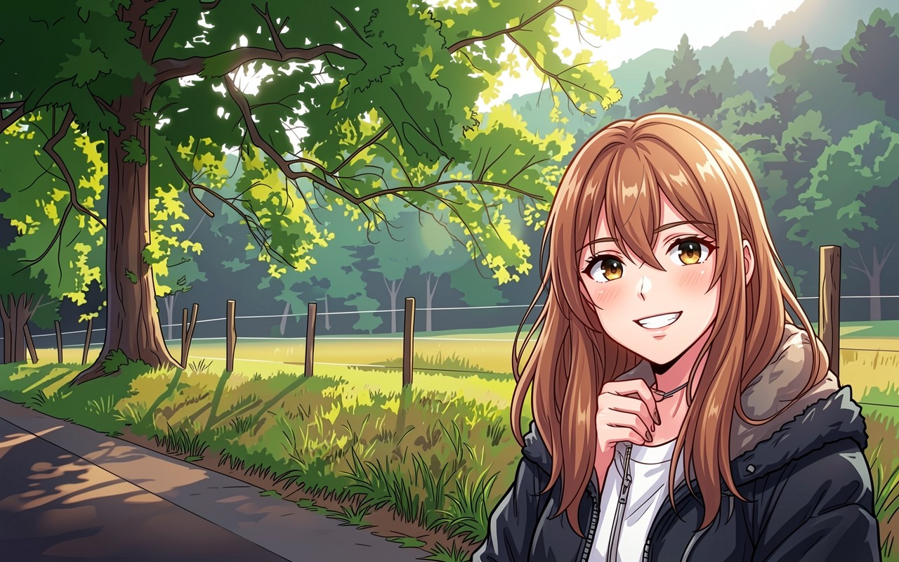 Аниме девушка с рыжими волосами в парке
