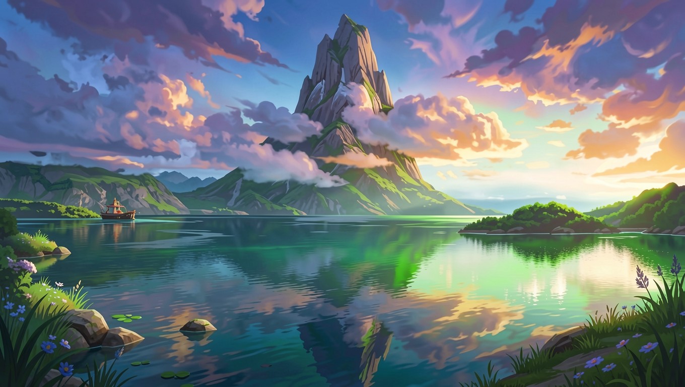 Фантастический пейзаж с высокой горой закат