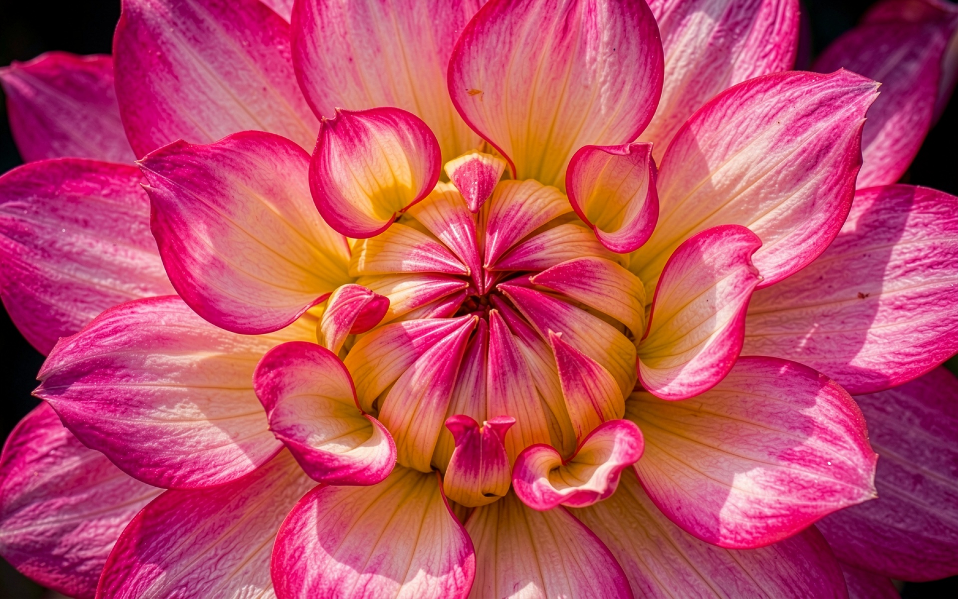 Розово-желтая георгина в макросъемке на черном фоне
