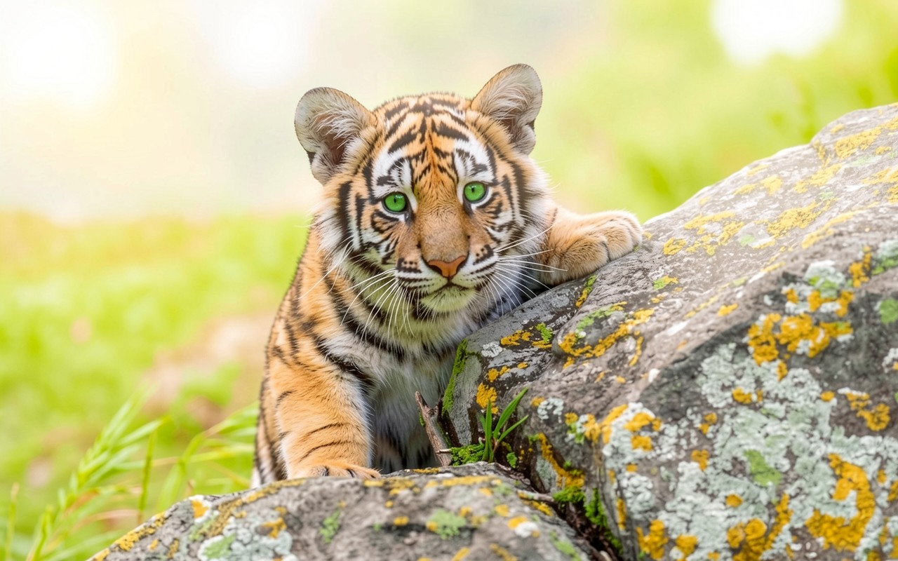 Тигренок с зелеными глазами на серых камнях