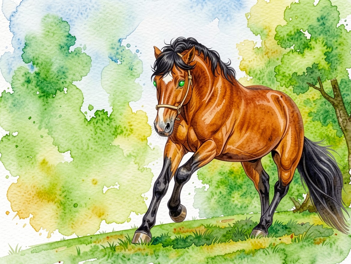 Рыжая лошадь с зелеными глазами акварель