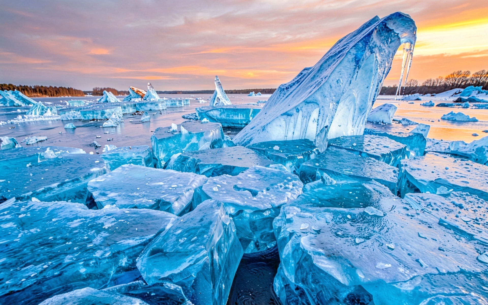 Голубые ледяные глыбы на закате зимы
