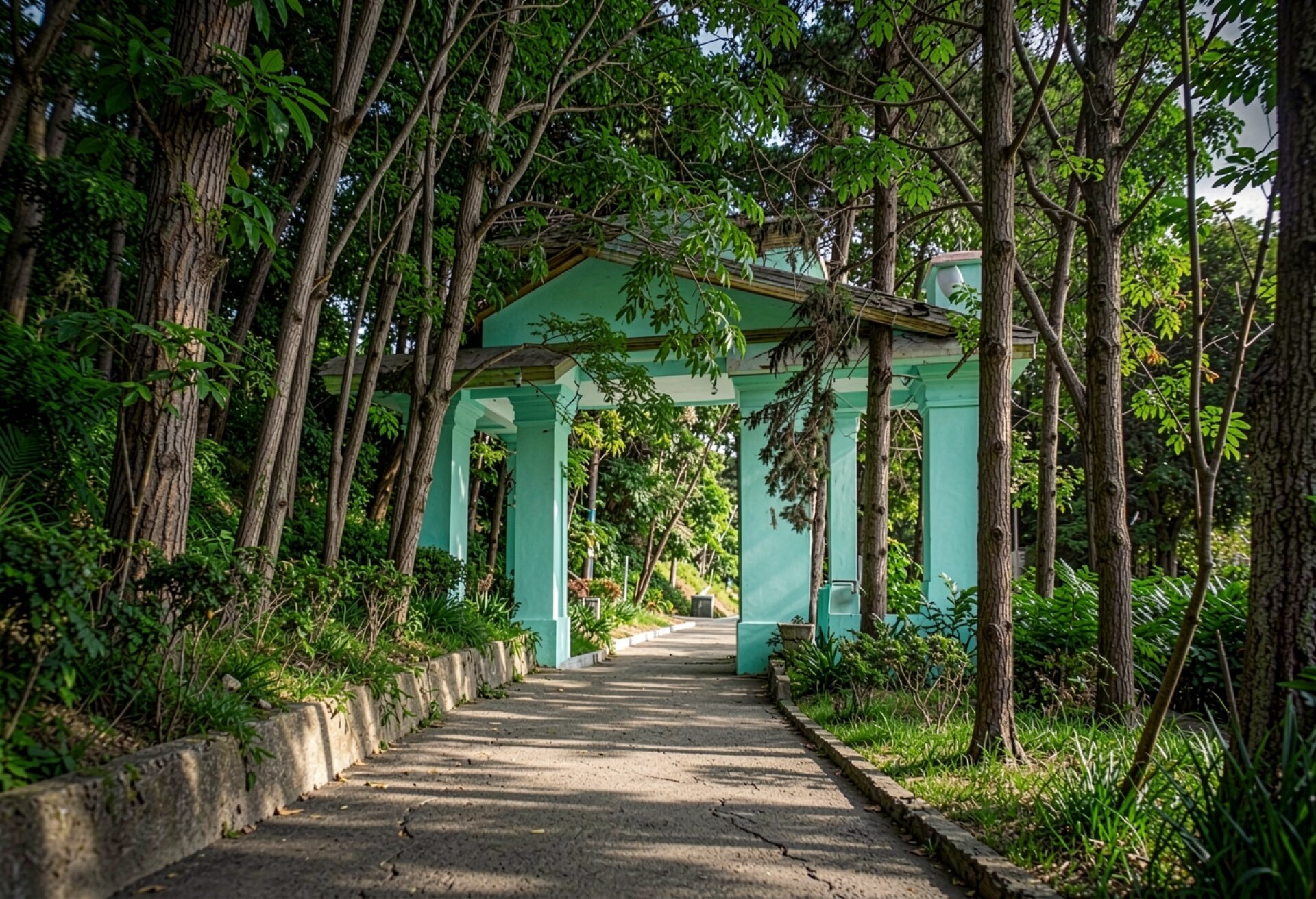 Голубая садовая беседка в зеленом летнем парке