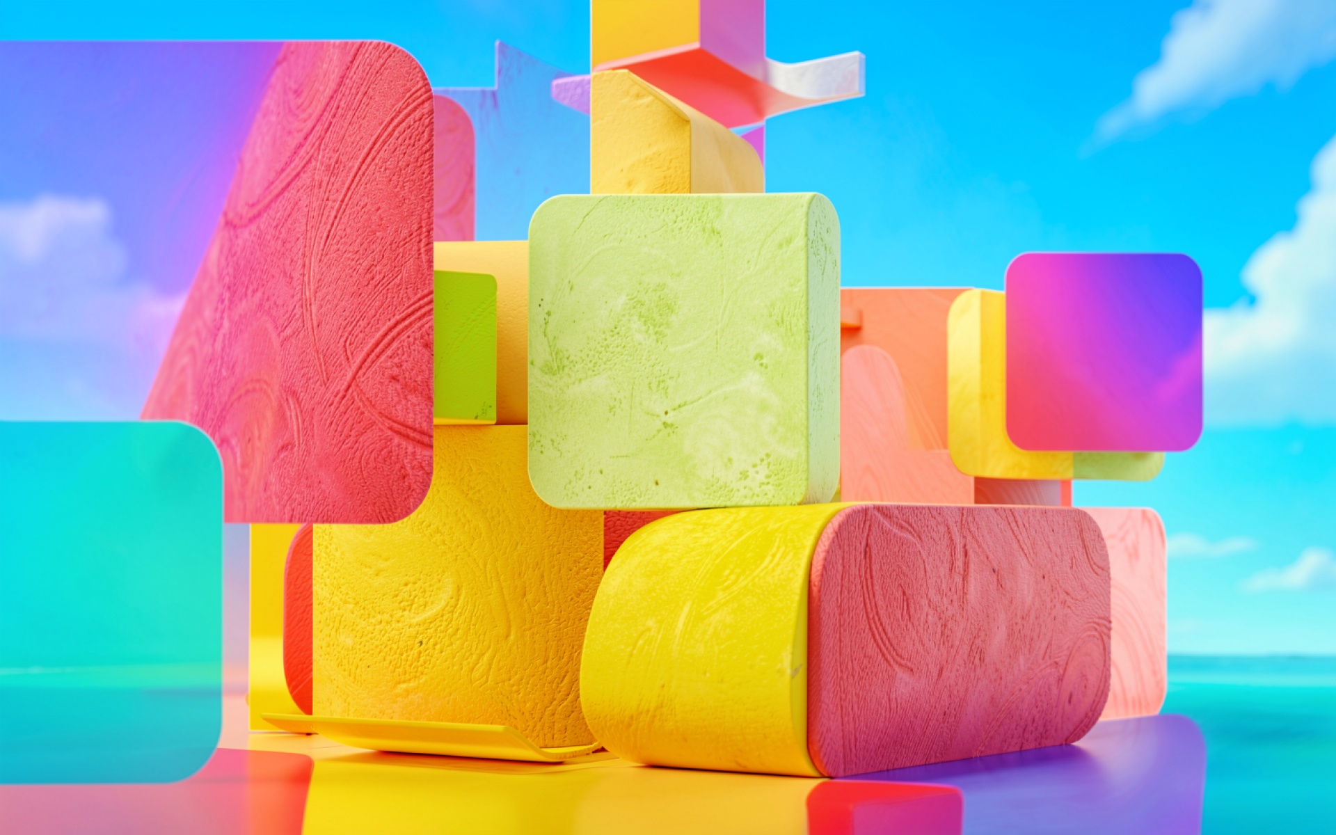 Абстрактные цветные фигуры на фоне голубого неба