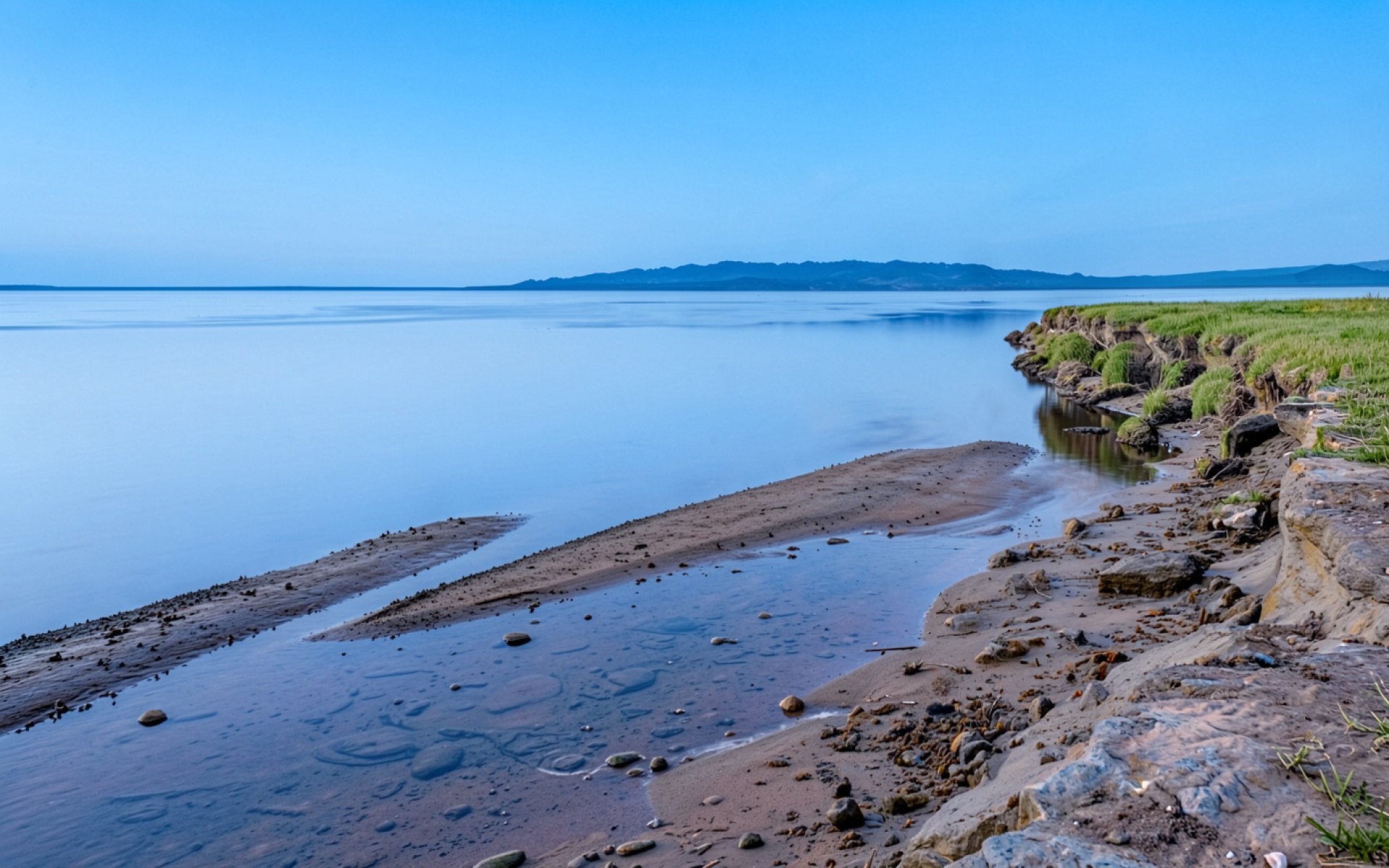 Голубое озеро с песчаным берегом и горами