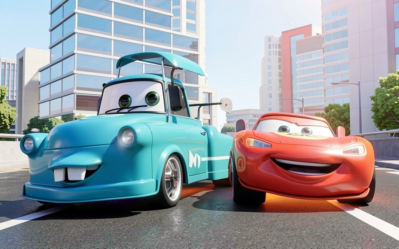 Голубой Мэтр и красный Молния Маккуин в городе