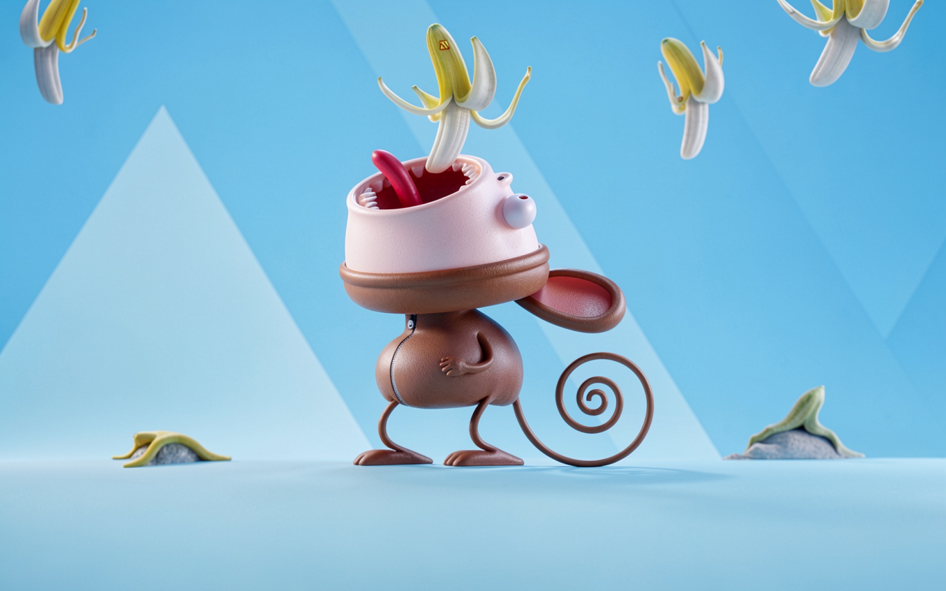 3D персонаж обезьяна с бананами голубой фон