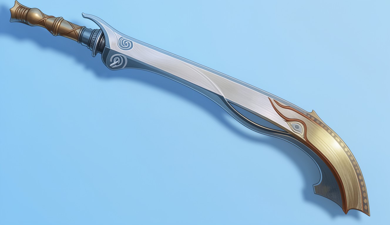 Фантастический изогнутый меч золотого цвета голубой фон