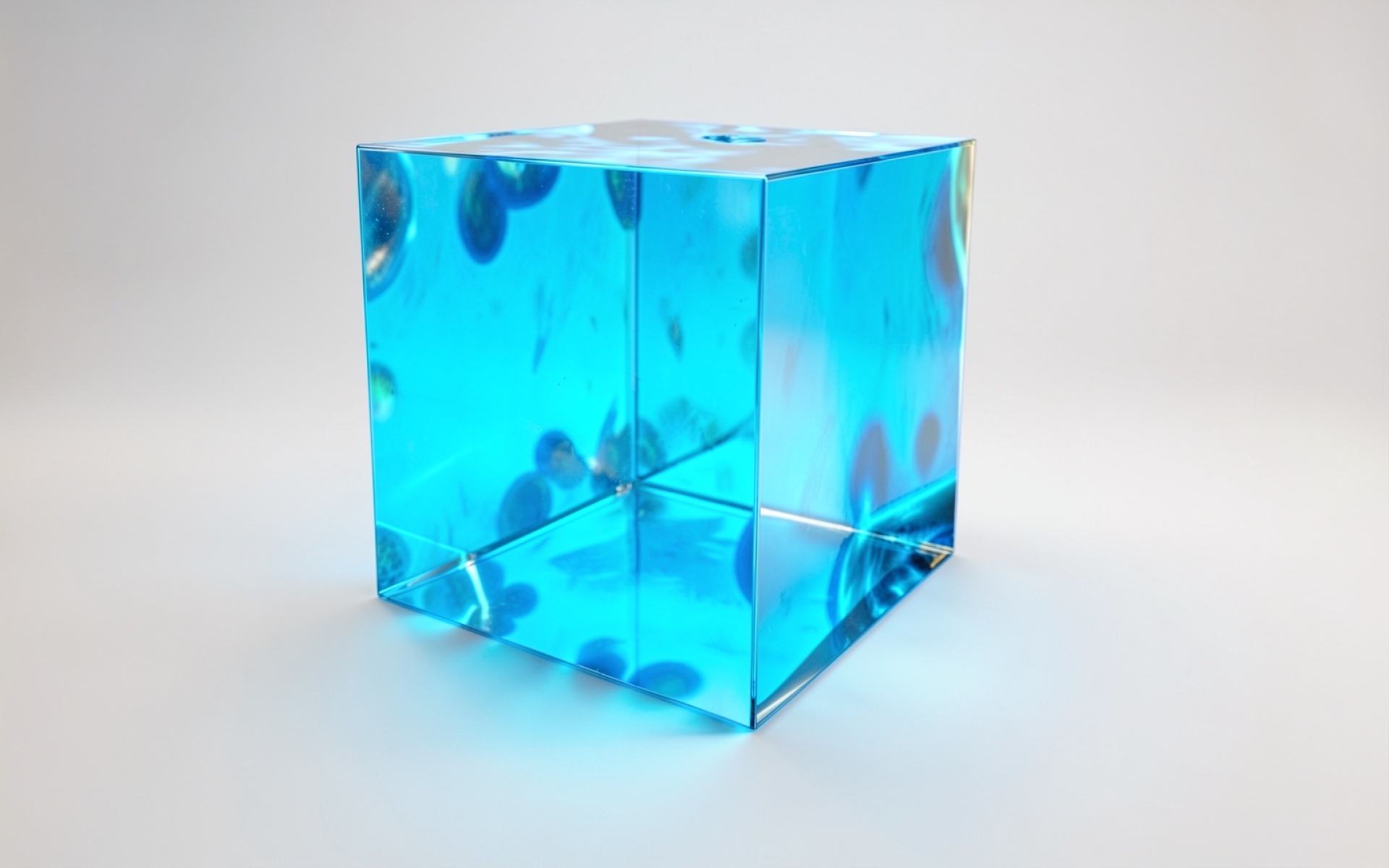 Голубой стеклянный куб в минималистичном белом пространстве