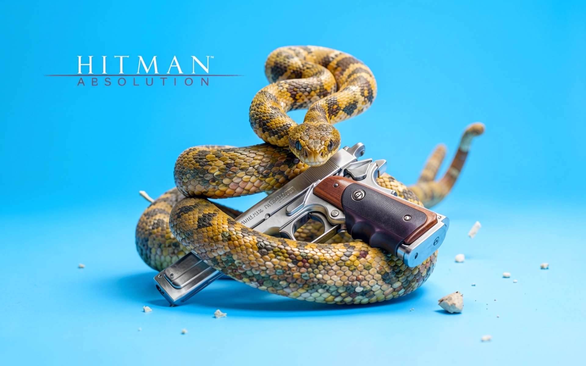 Желтая змея с пистолетом на голубом фоне