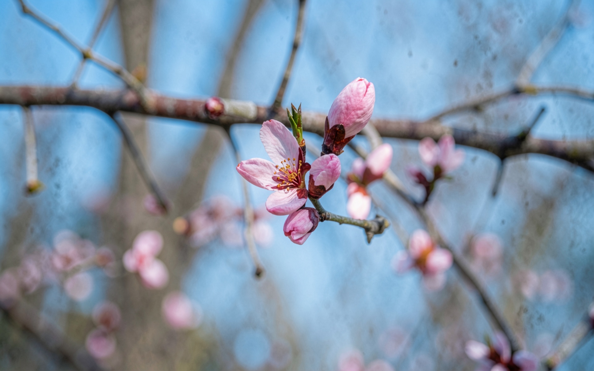 Розовые цветы миндаля на голубом фоне