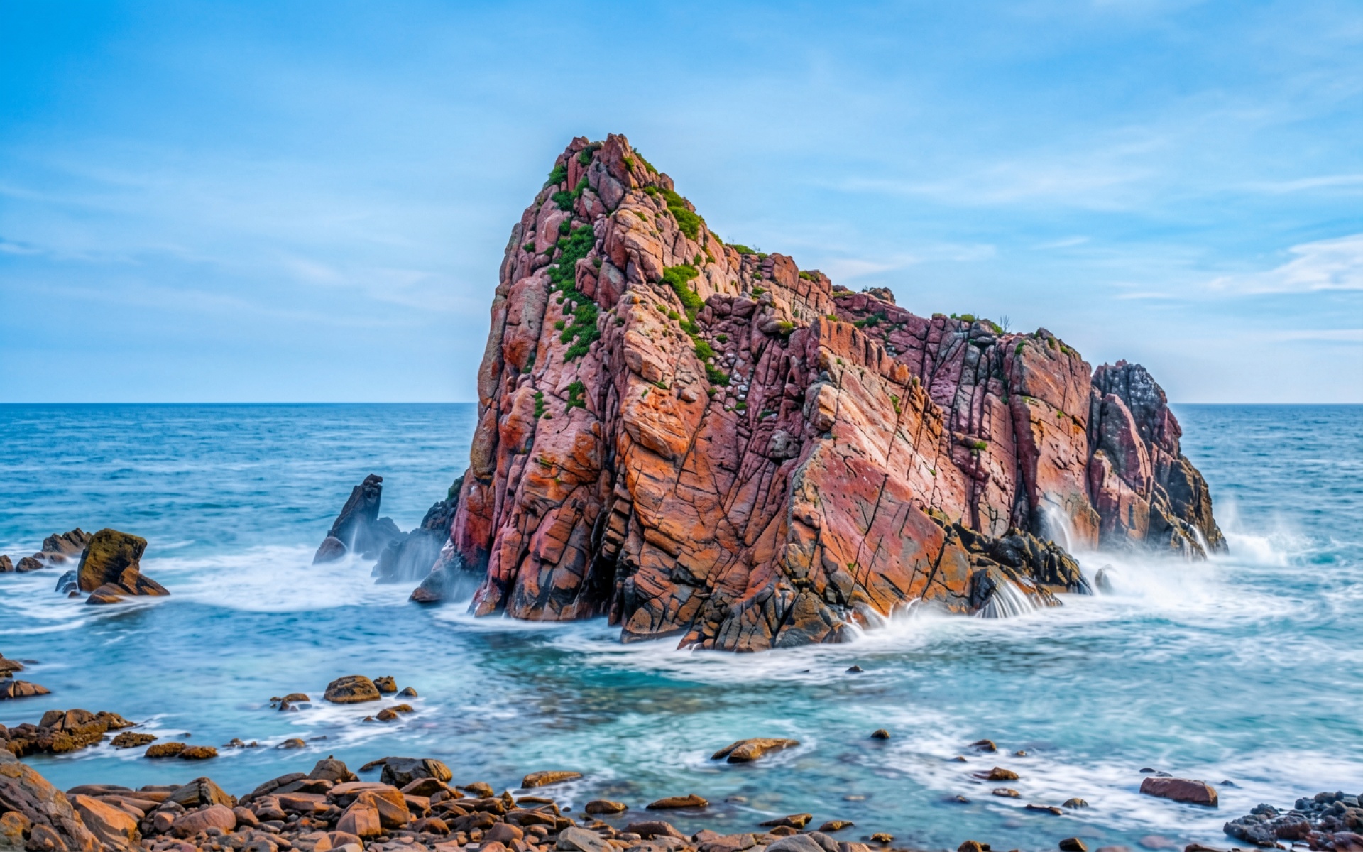 Красная скала в голубом океане при дневном свете