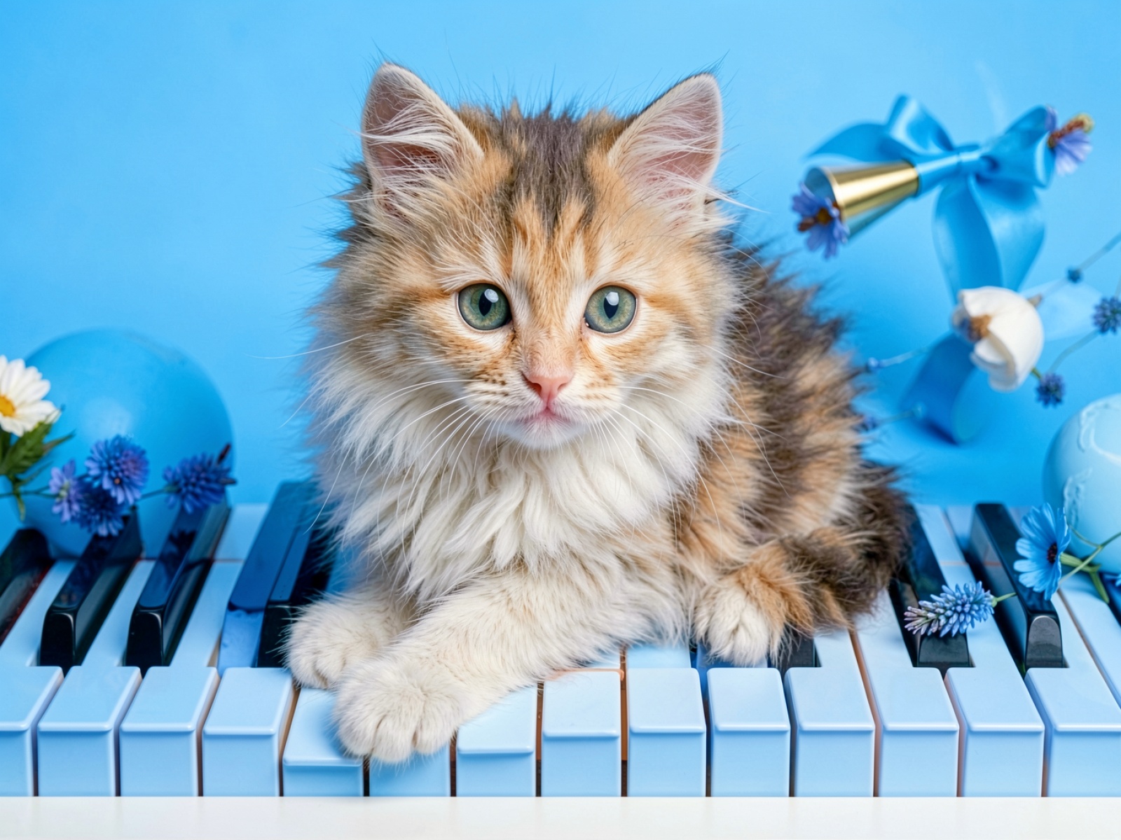 Рыжий пушистый котенок на голубом пианино