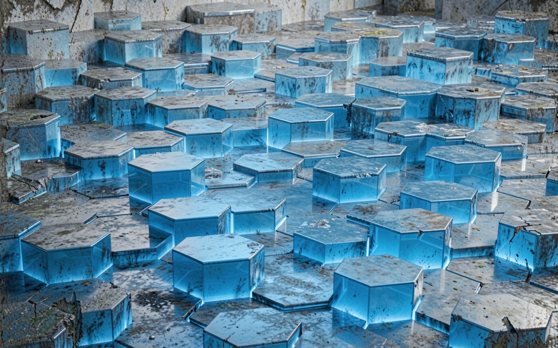 Голубые стеклянные гексагоны в футуристическом интерьере