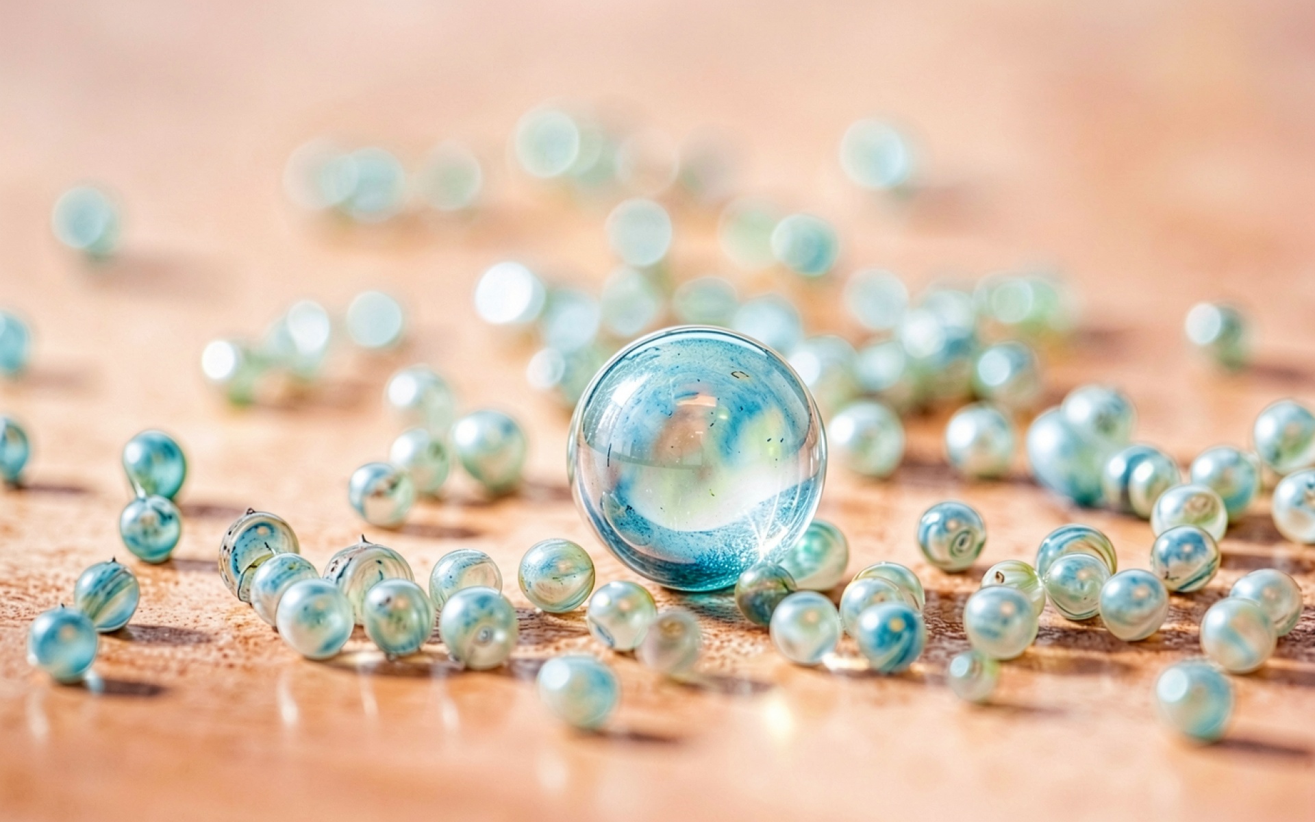 Стеклянные голубые шары на деревянном фоне