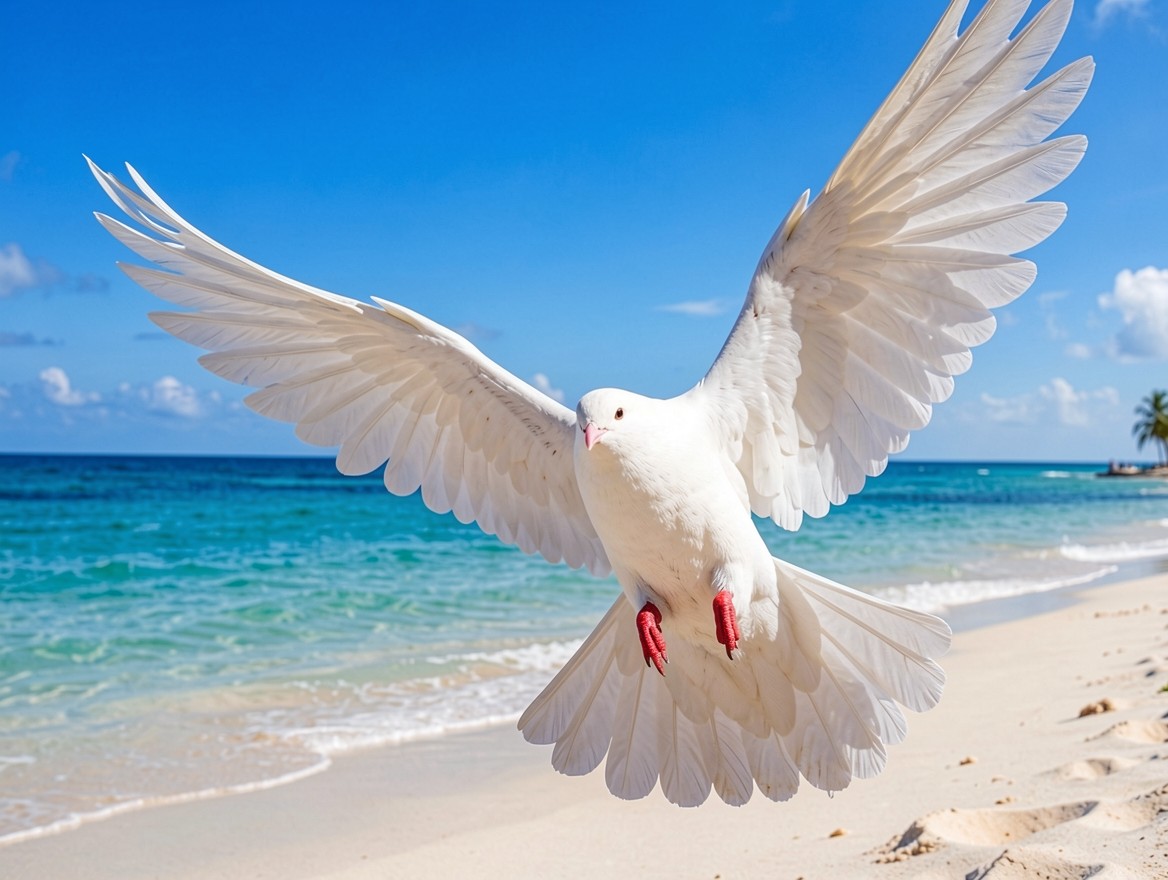 Белый голубь в полете над тропическим пляжем