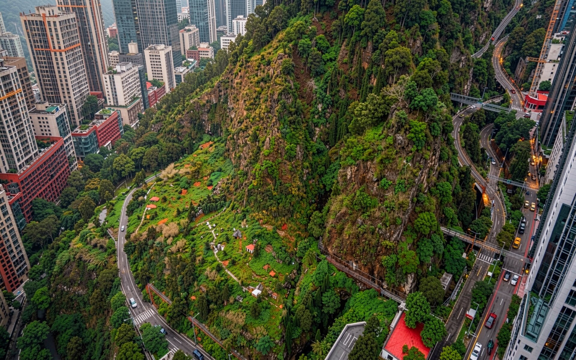 Городской пейзаж Гонконга с зелеными скалами