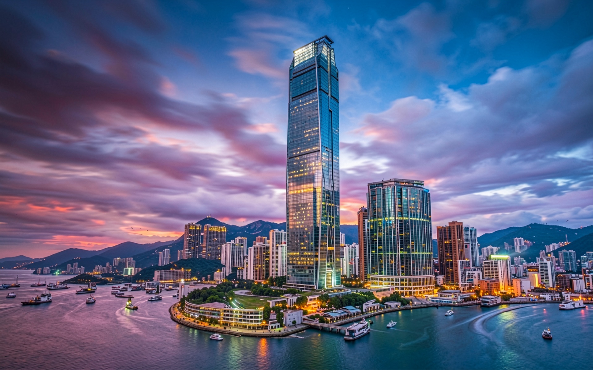 Небоскреб Международный финансовый центр Гонконга в сумерках