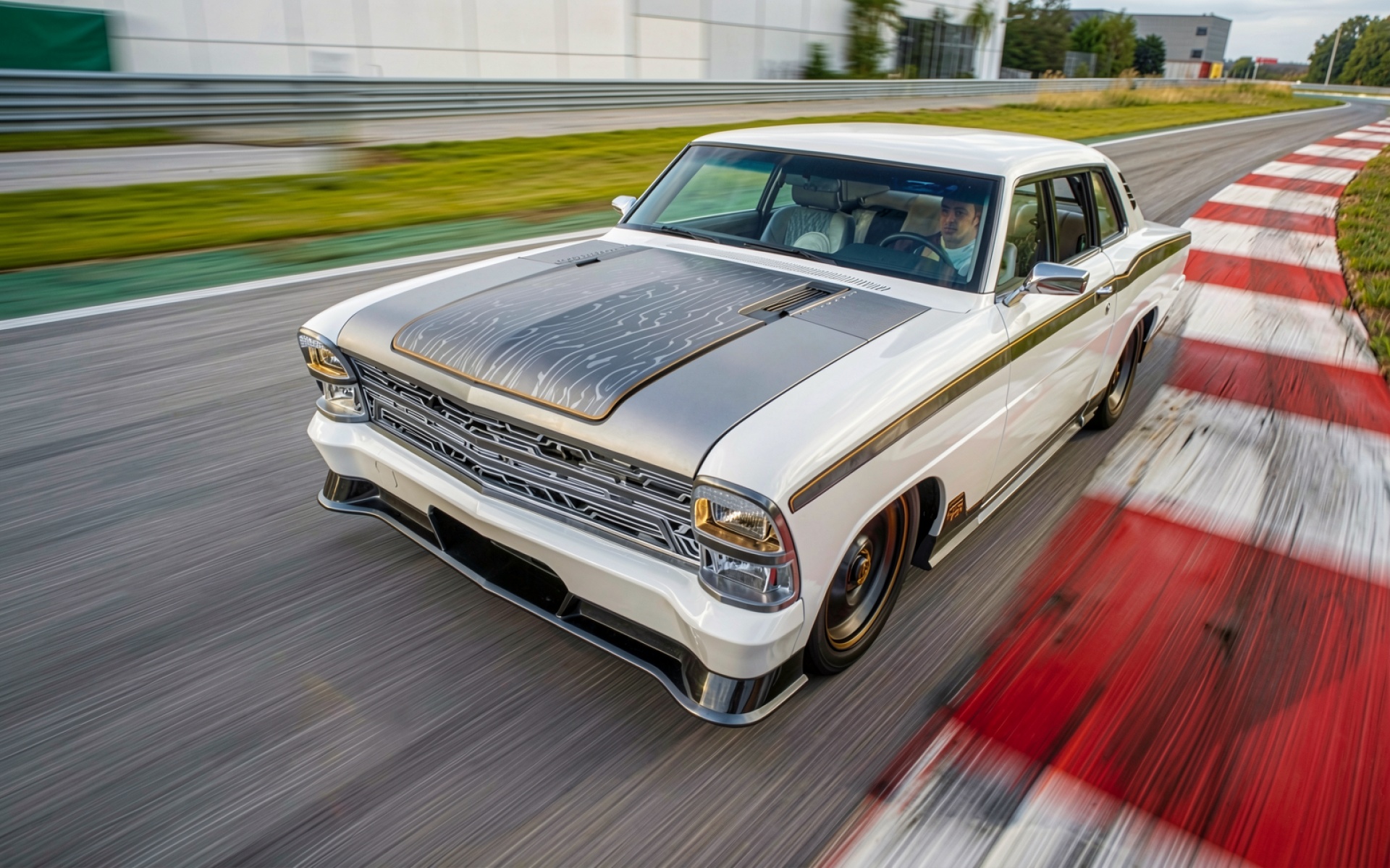 Белый классический автомобиль на гоночном треке