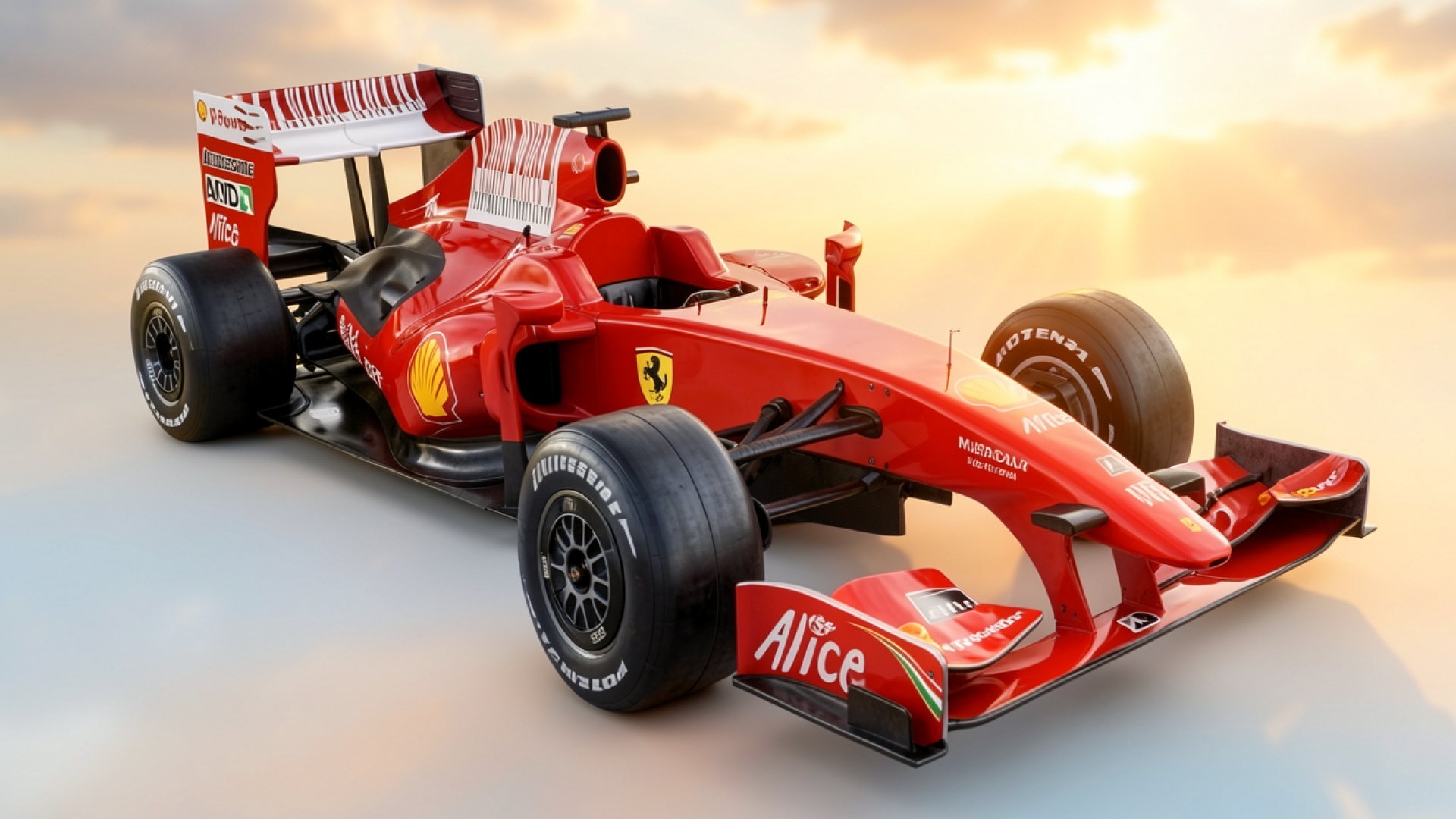 Красный гоночный болид Формулы-1 на закате