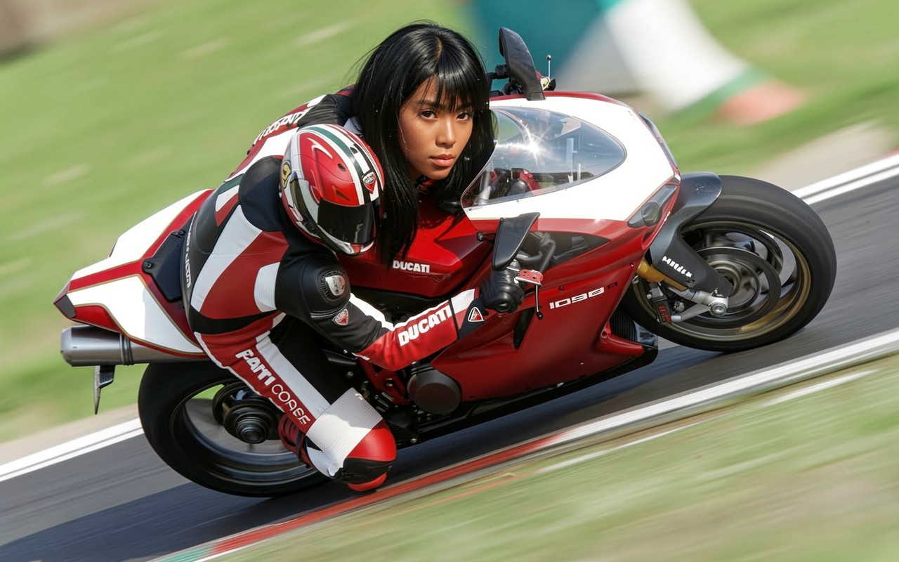 Девушка на мотоцикле Ducati гоночный трек