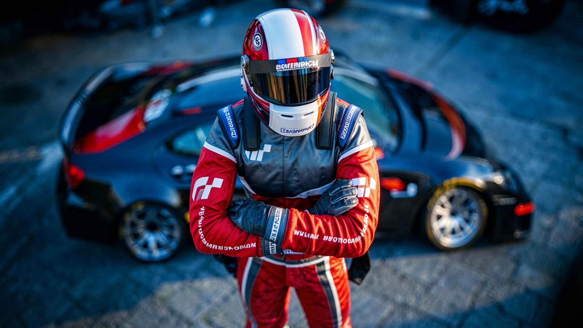 Гонщик в красном костюме на фоне авто