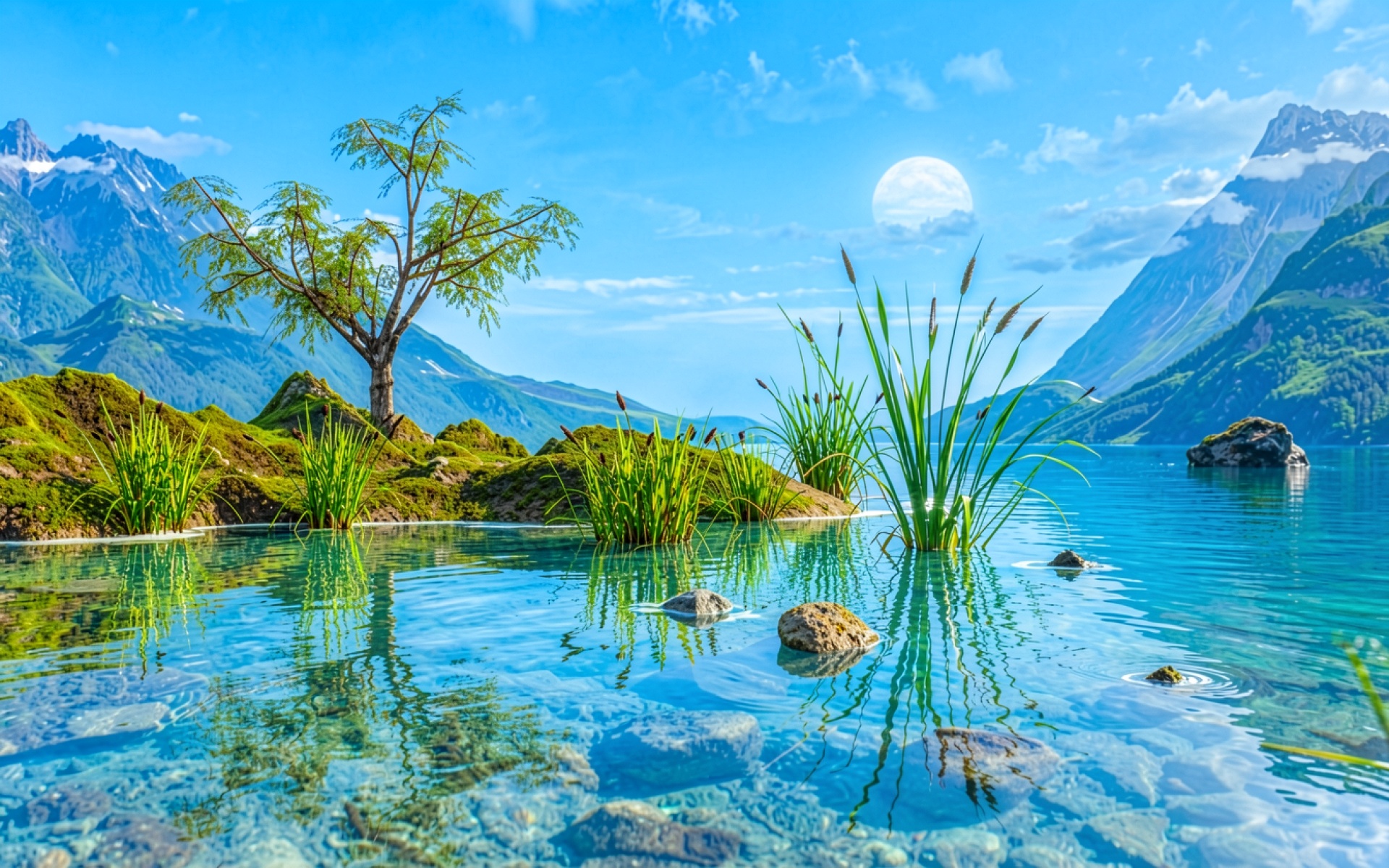 Одинокое дерево у голубого горного озера