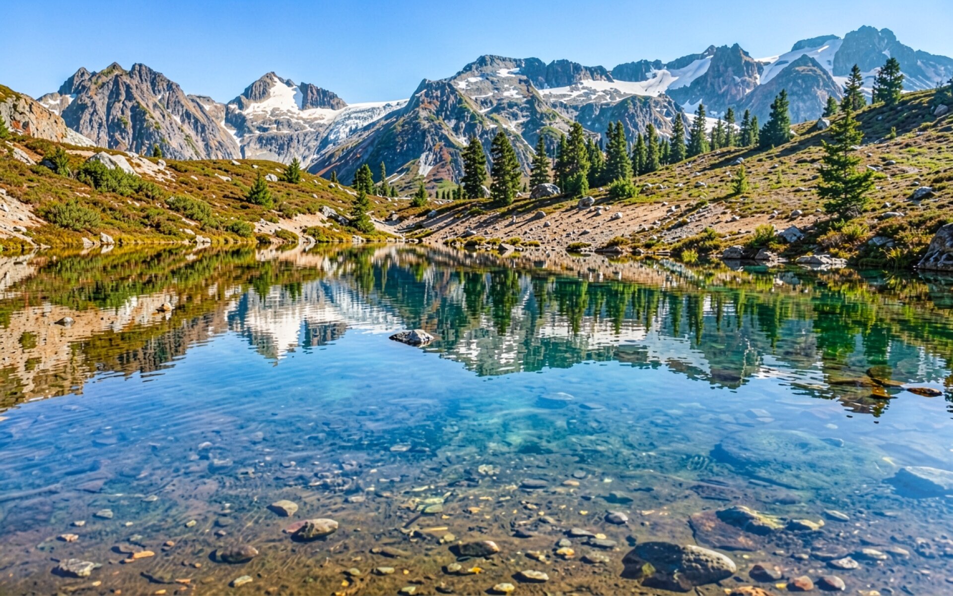 Горное озеро с прозрачной водой и заснеженными вершинами