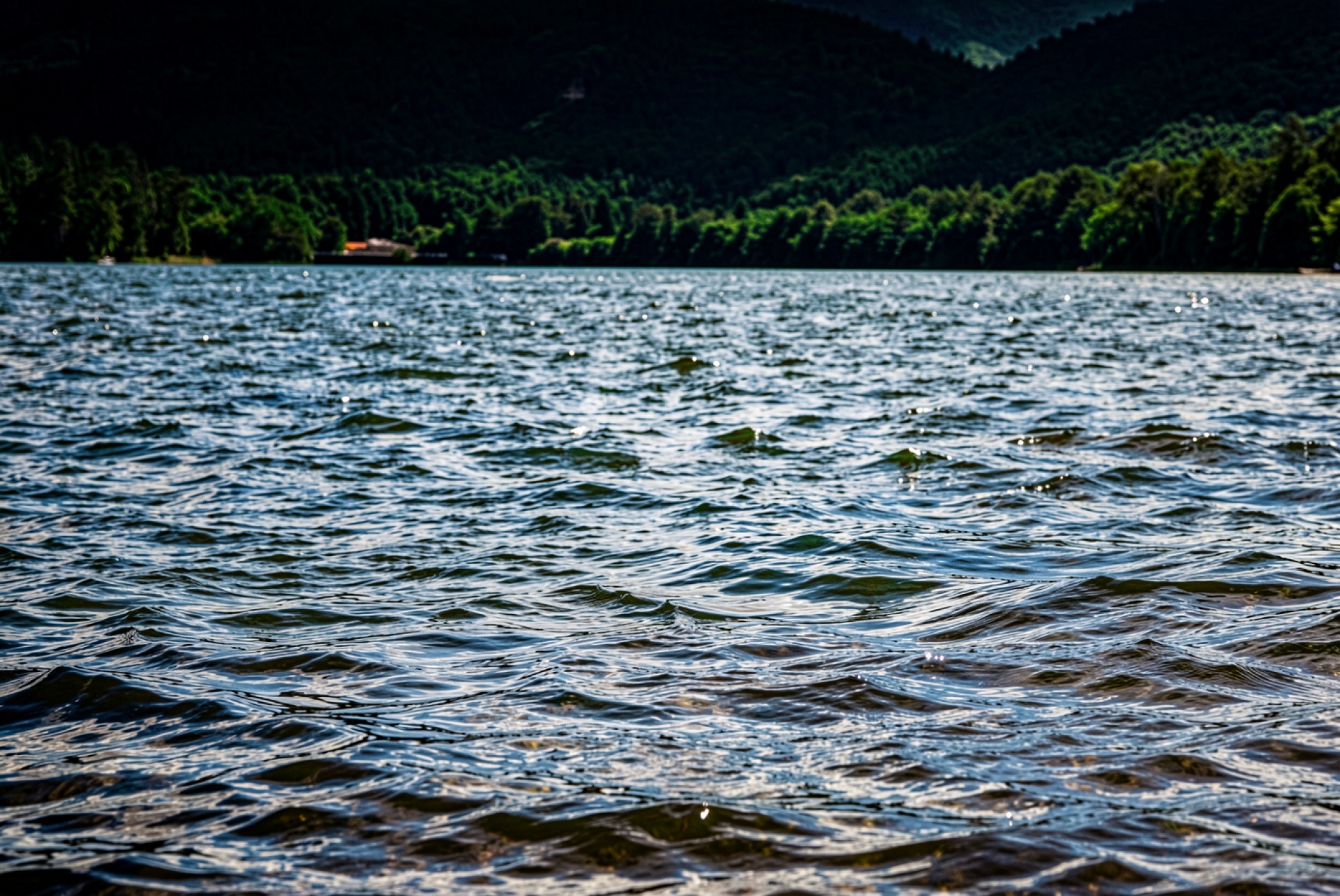 Горное озеро с темным лесом вокруг