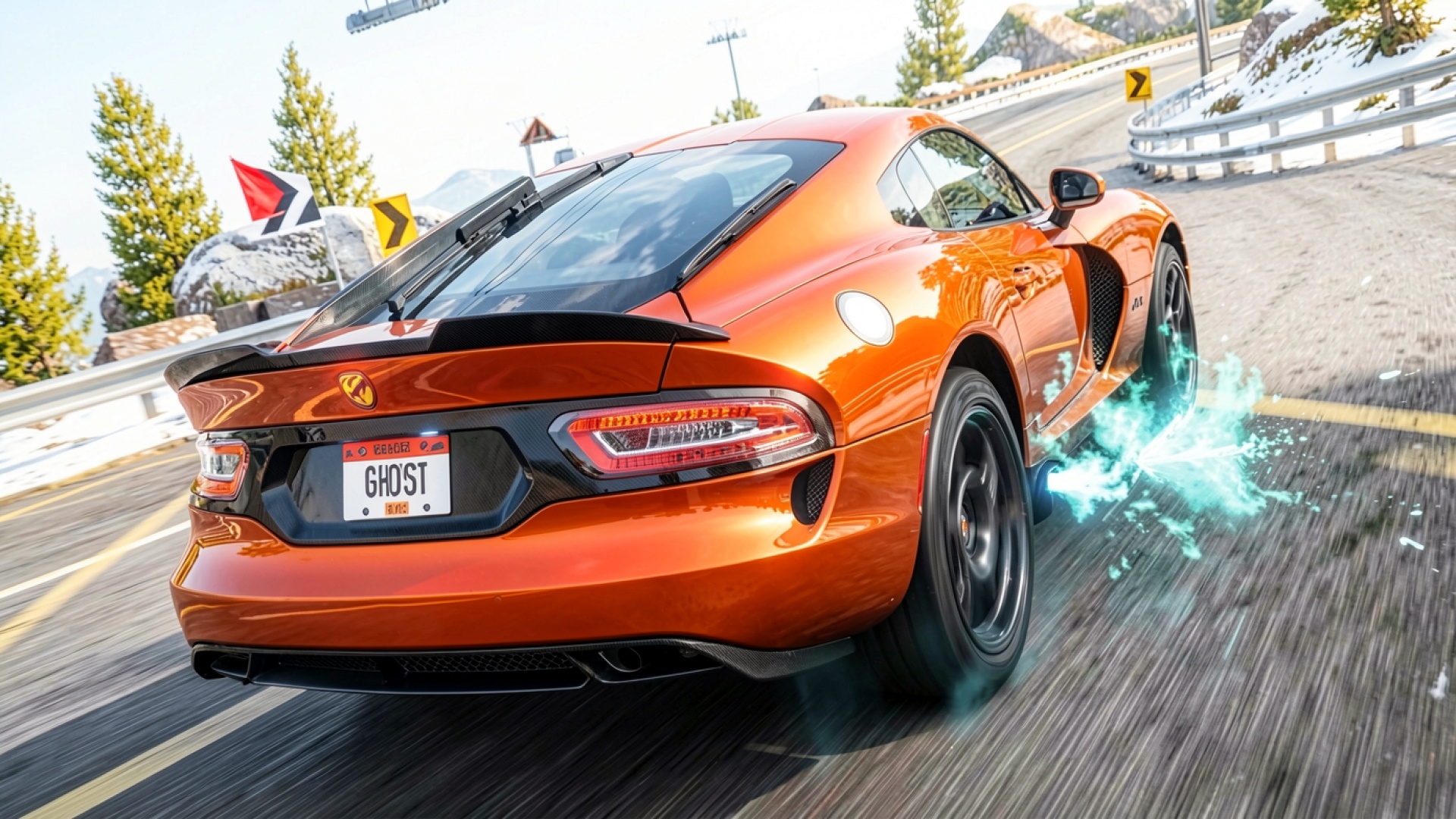 Оранжевый спортивный автомобиль на зимней горной дороге