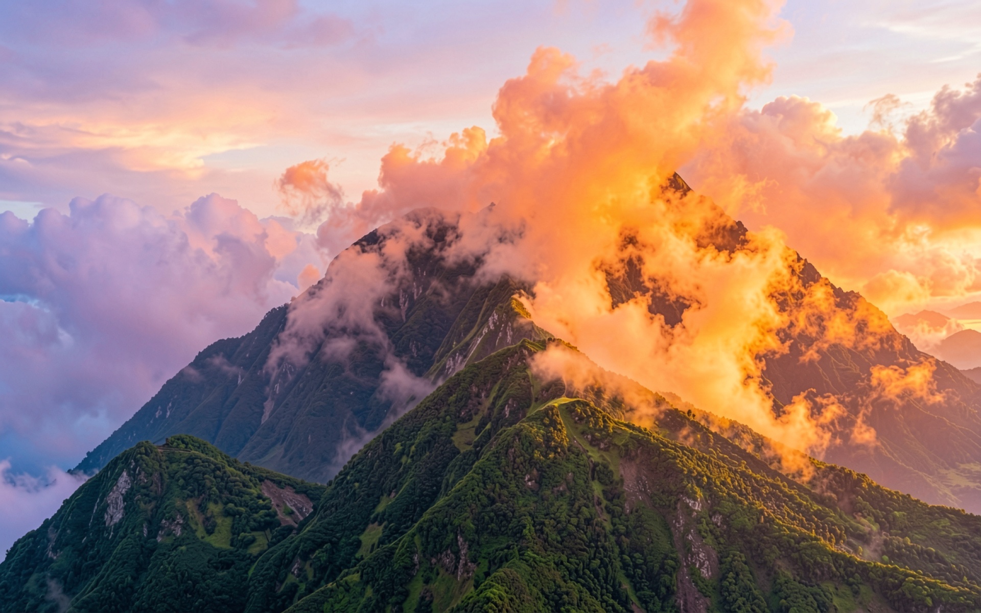 Горные вершины в золотых облаках на закате