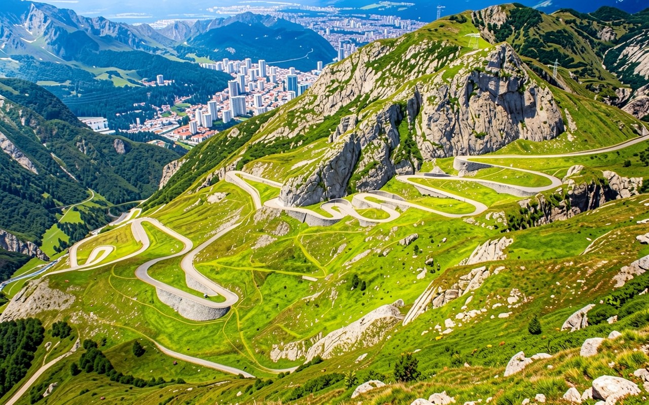 Горный серпантин зеленого склона с городом