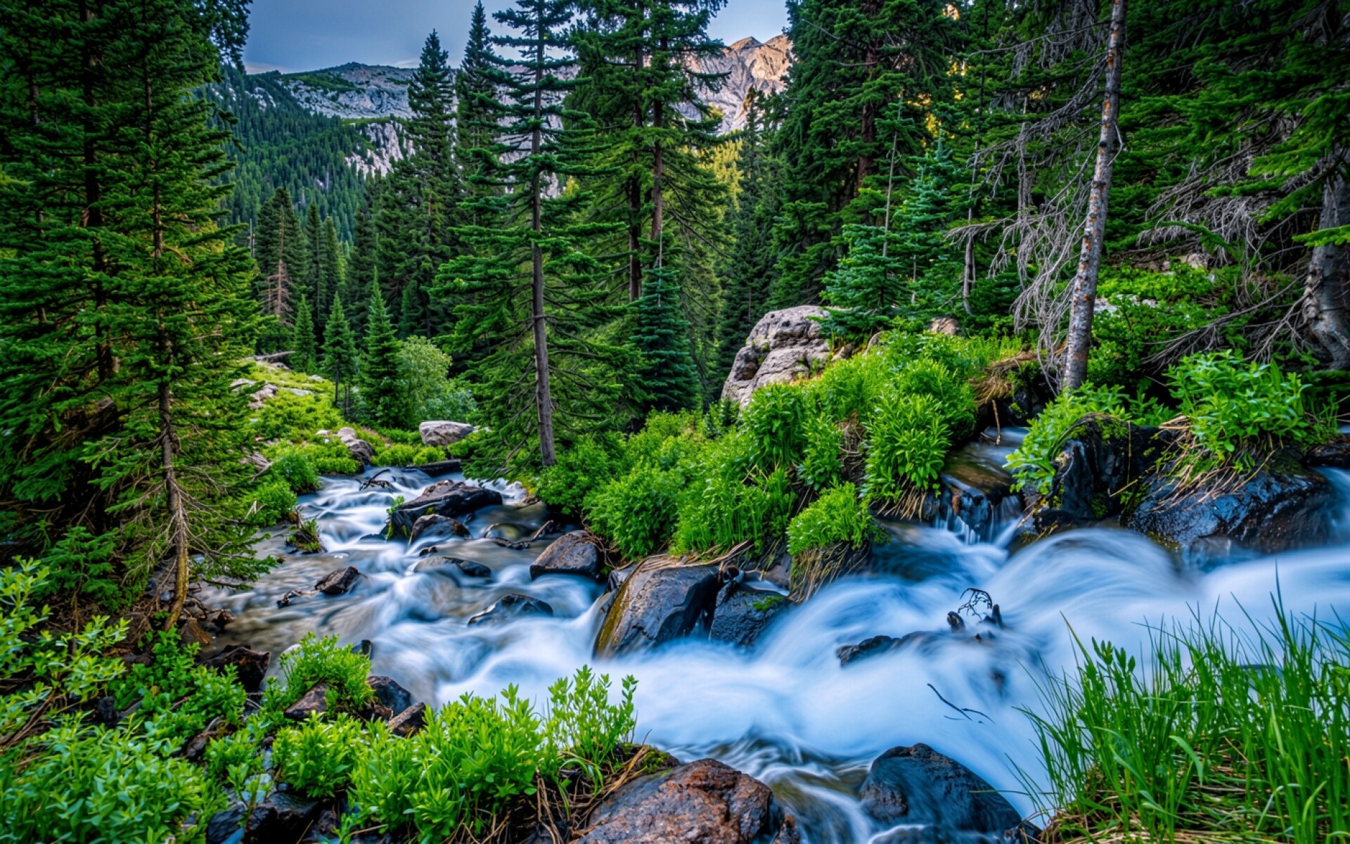 Горный ручей в хвойном лесу днем