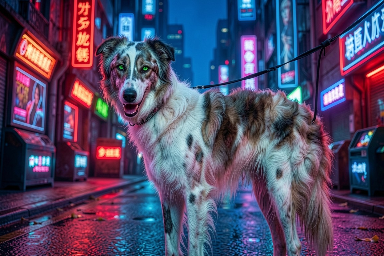 Собака бордер-колли неоновый город киберпанк