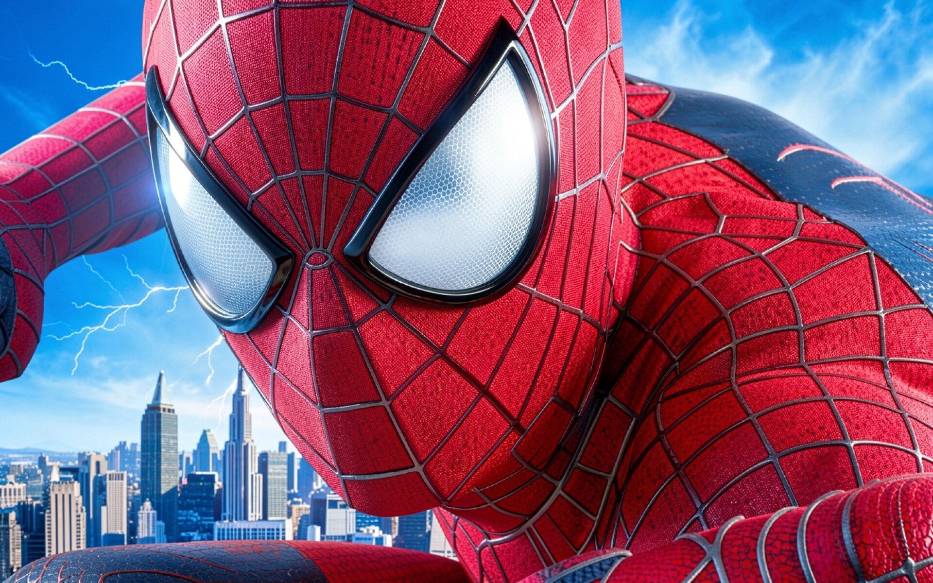 Человек-паук в красном костюме на фоне города