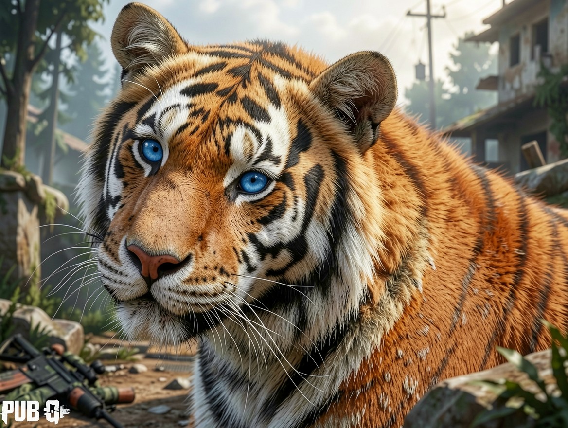 Тигр с голубыми глазами в заброшенном городе