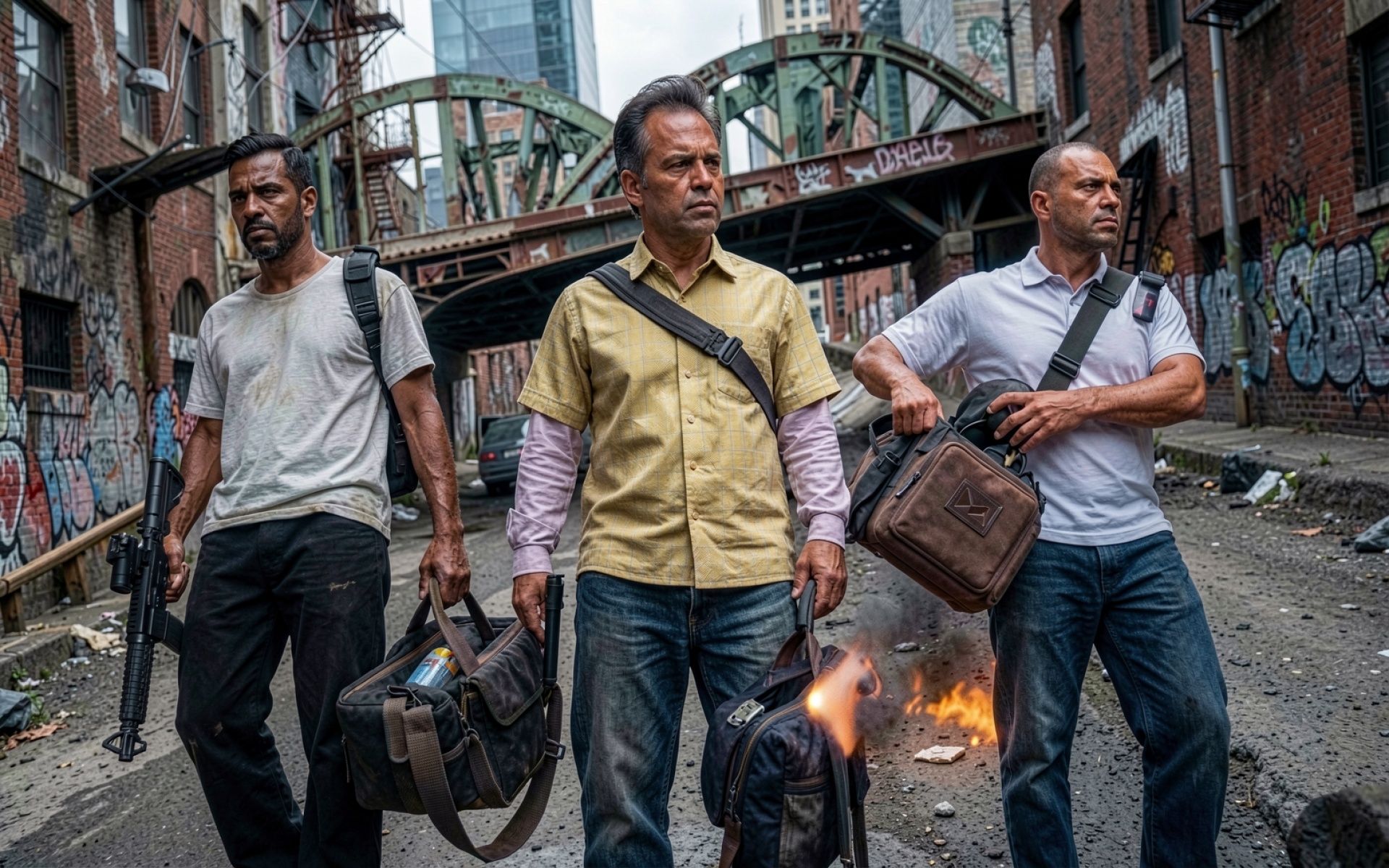 Три мужчины в индустриальном городе с сумками