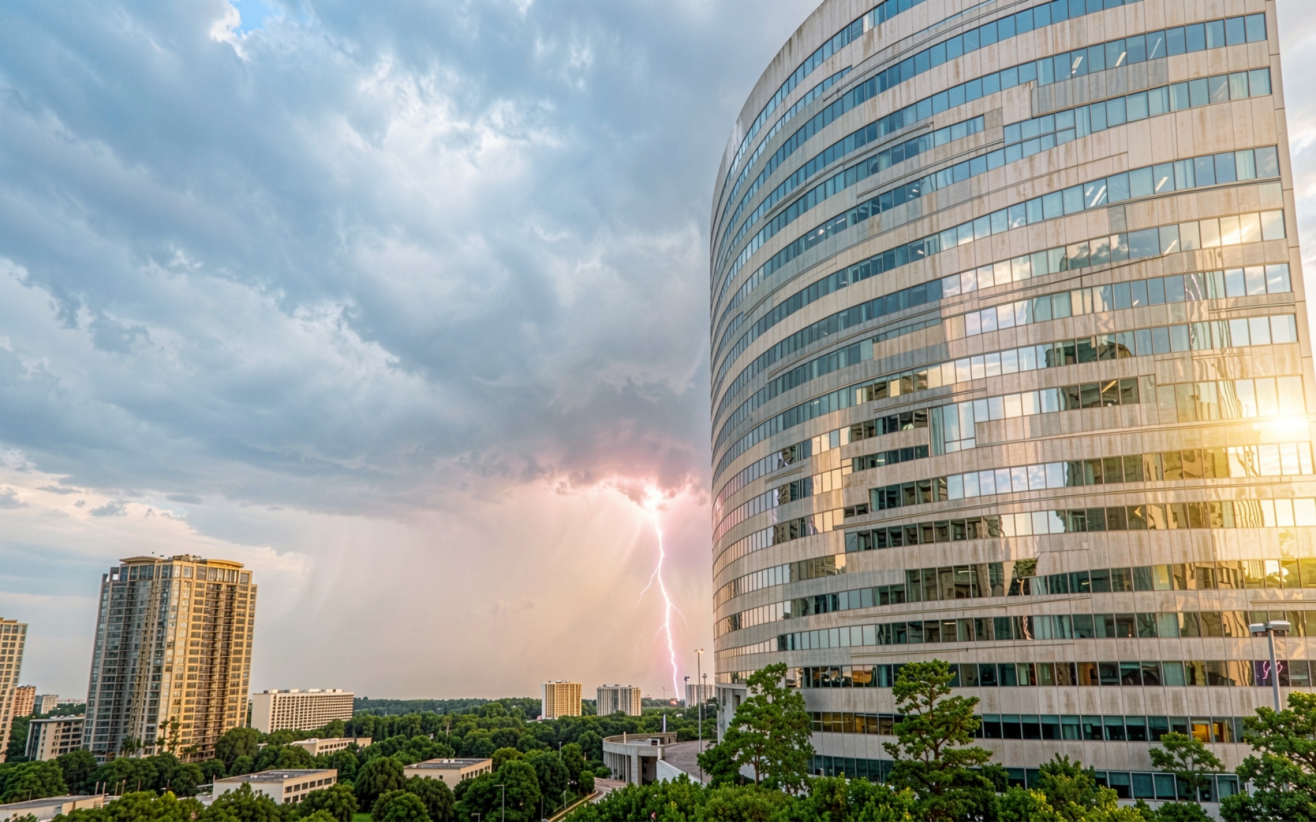 Молния над современным городом в сумерках
