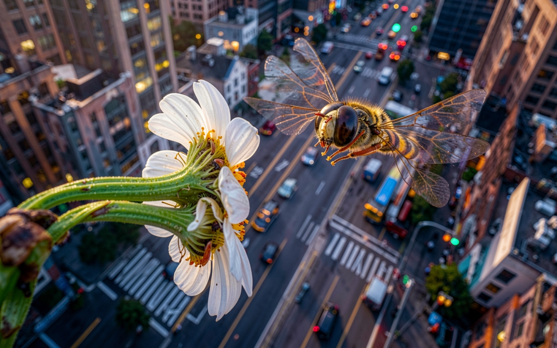 Пчела у белого цветка над городским перекрестком