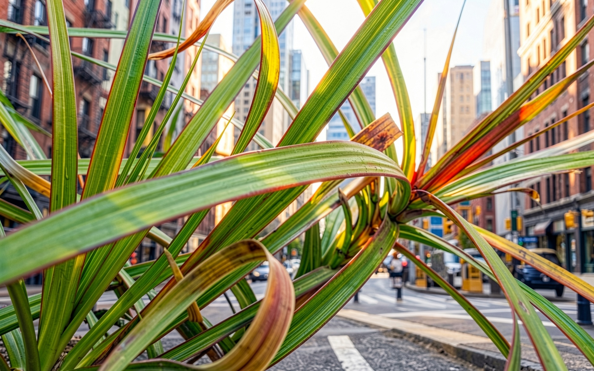 Зеленый тропический куст на фоне городских зданий