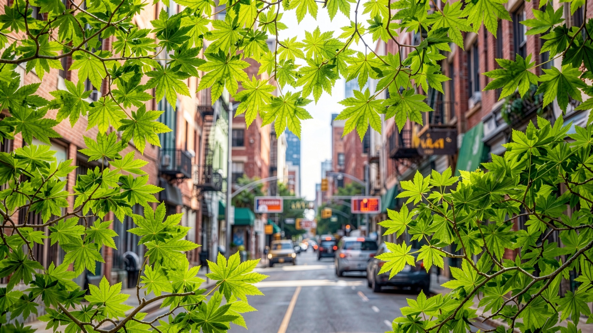 Зеленые листья клена в городской улице