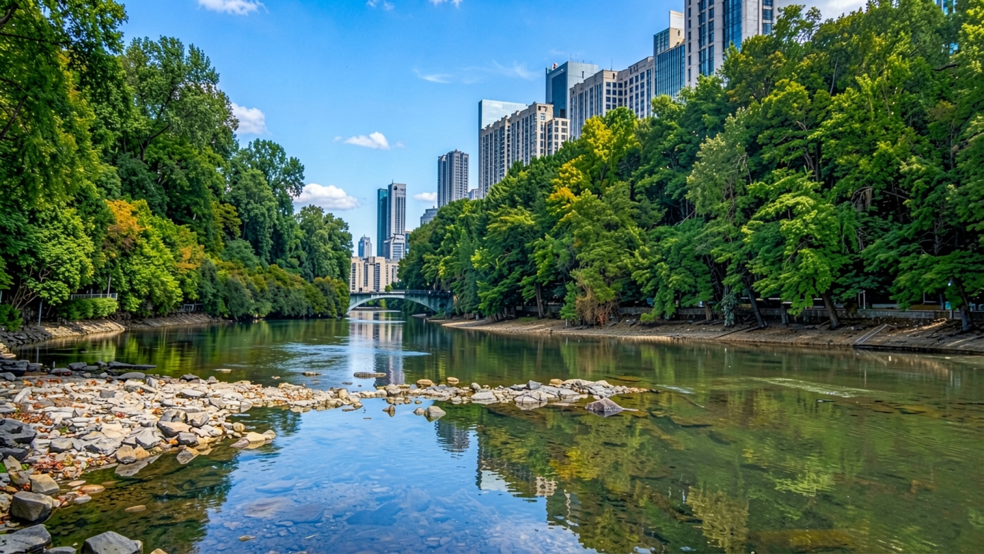 Городской пейзаж с рекой и небоскребами