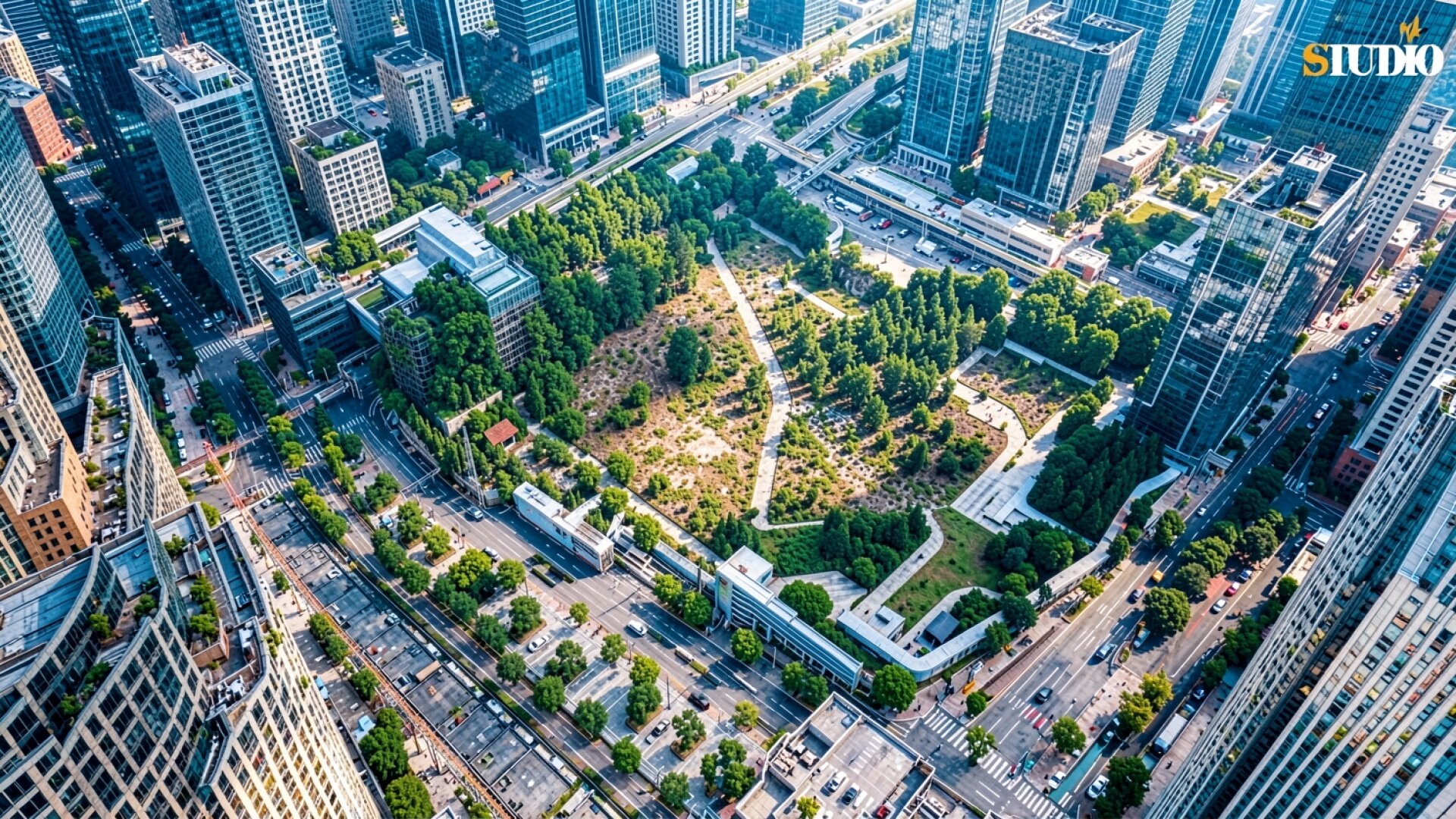 Городской парк среди небоскребов в солнечный день